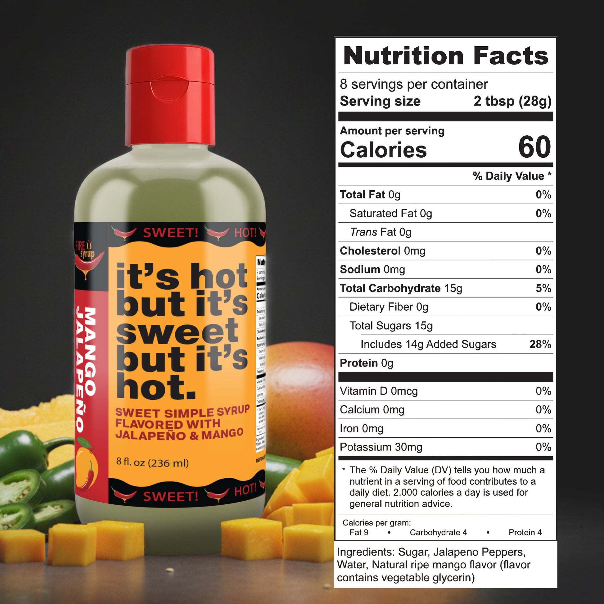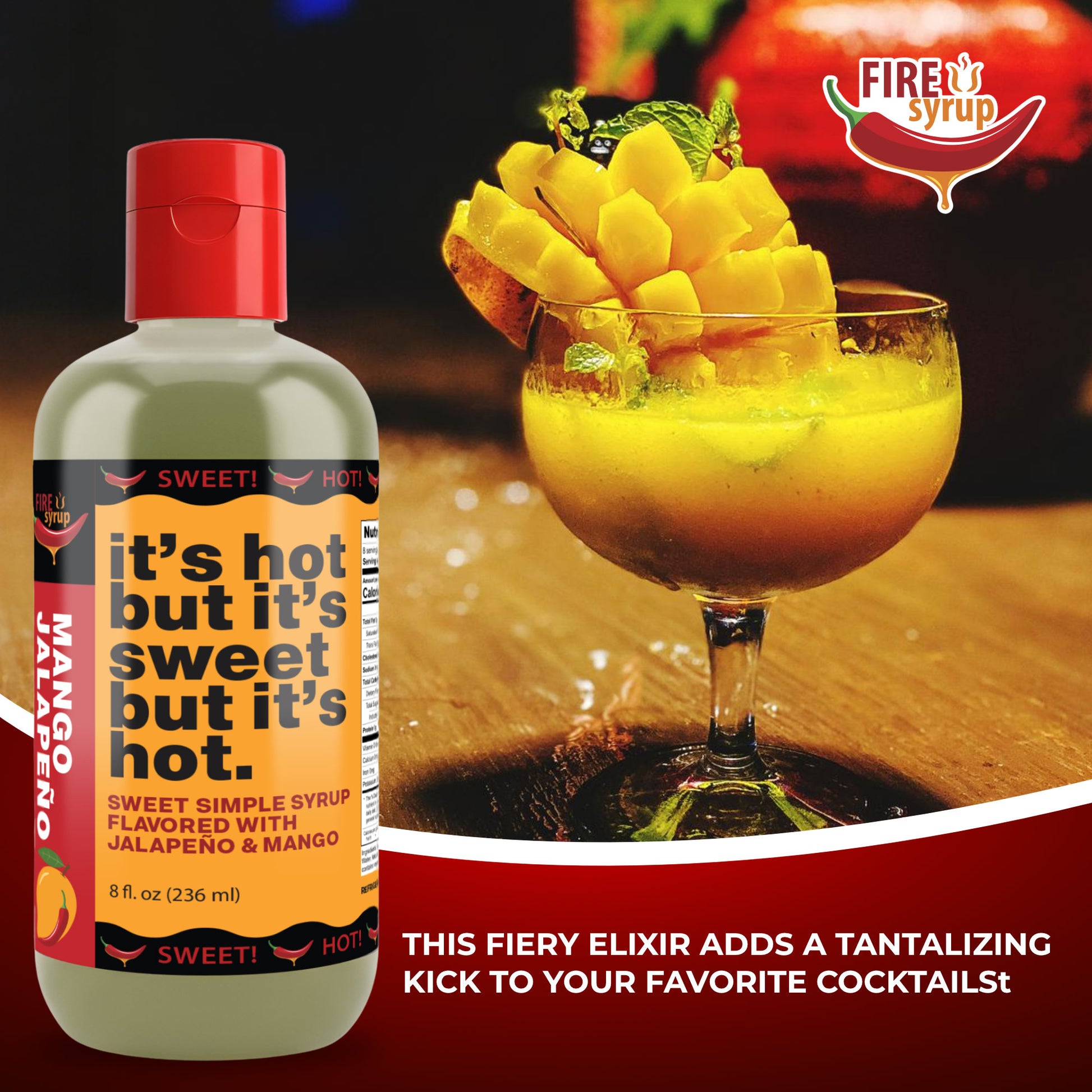 - MANGO JALAPENO FIRE SYRUP: This bottle of Fire Syrup is made with real jalapeno peppers with a touch of mango flavor! Get that sweet and spicy kick in every drop of this amazing cocktail syrup.